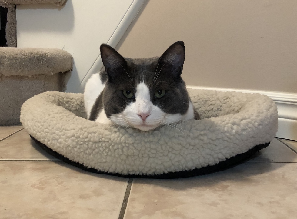 He was adopted eight years ago. Loves bum pats and playing catch with sponge balls. He’s a talker!