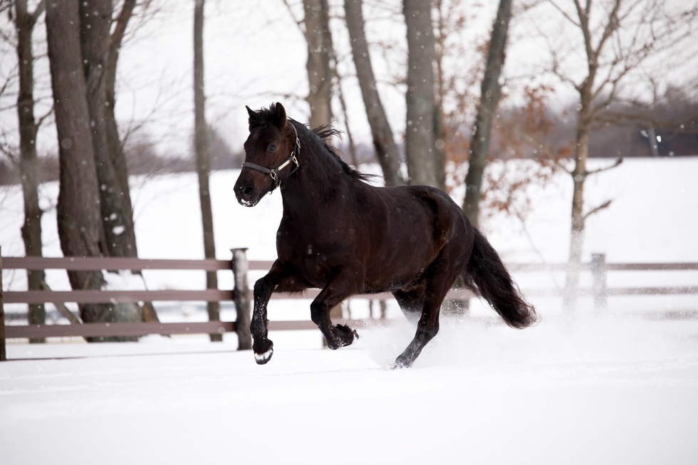 Pony galloping in the snow.