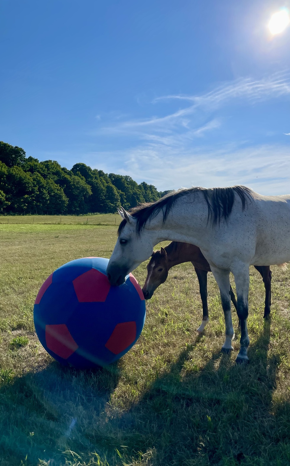 Beretta and her filly Violet get ready to play with a large ball. The foals love playing ball!