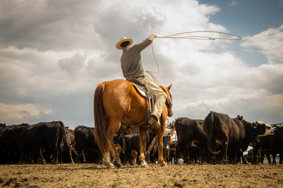 A Montana cowboy looks for his next calf to drag to the branding fire.