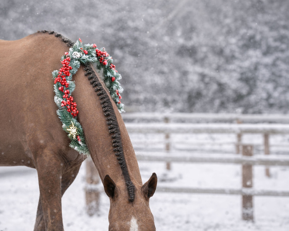 A braided horse wearing a wreath in the snow.