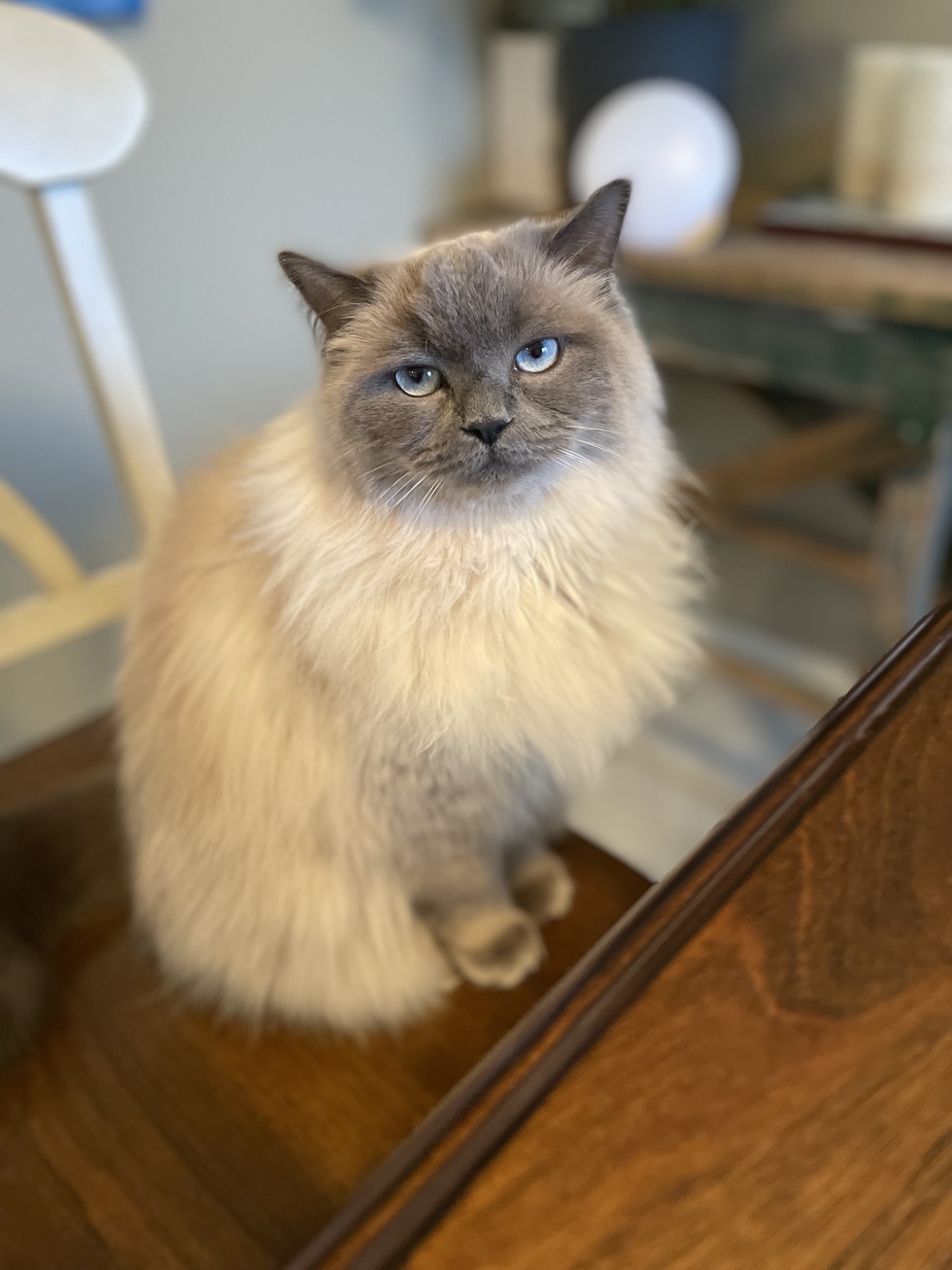 Meet Bindi, a stunning Ragdoll who perfectly balances elegance with a side of sass. When she isn’t gracefully lounging in her outdoor catio or surveying her kingdom from the window, she’s busy perfecting the art of "the chill." While she’s a notoriously picky eater with a refined palate, she’s fiercely devoted to her family—including her Yorkie sister, Kenzie. She’s beauty, she’s grace, and she’ll definitely give you a look if you get too close to her humans!