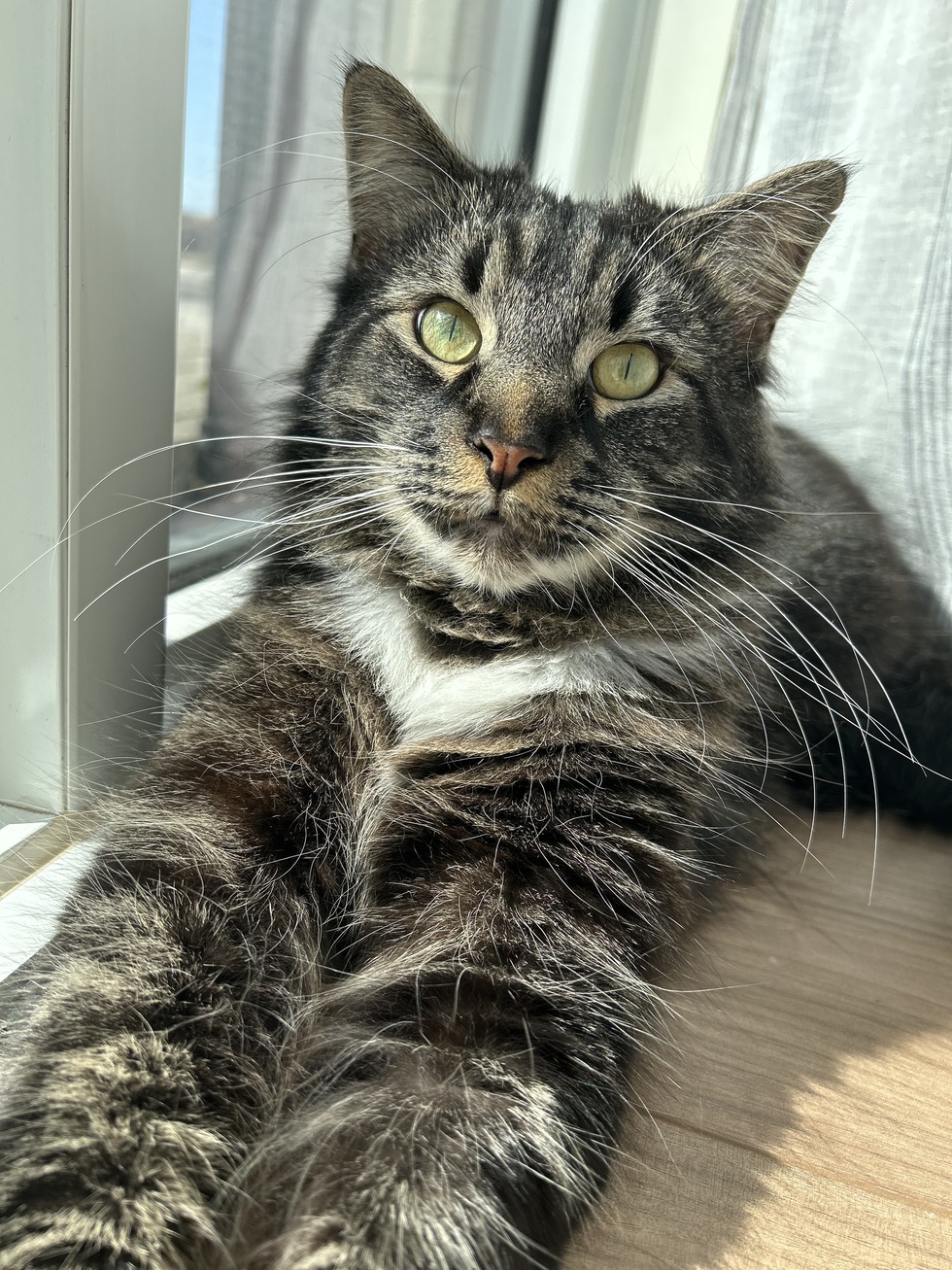 It’s just the two of us at home, and he has completely filled my life with personality, routine, and love. Leo isn’t a lap cat, but he’s always close by. He loves curling up beside me on the couch or in bed, and one of his favorite ways to show affection is by gently nuzzling his face into mine while I pet him.