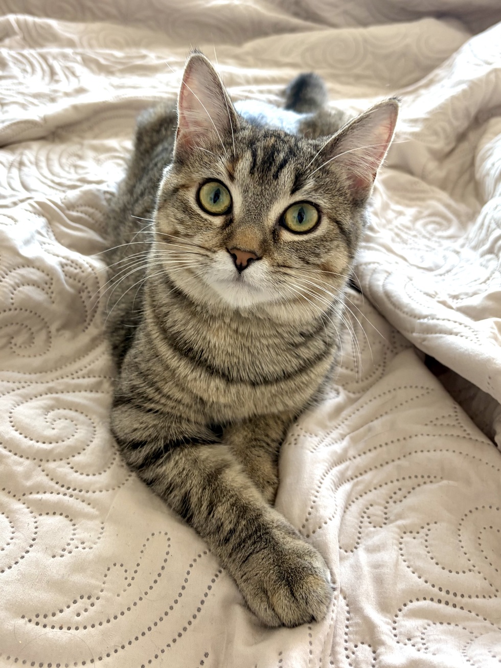 Nellie is a curious and playful kitten who was adopted from Oakville’s Humane Society! She loves spring toys, climbing, and making biscuits. Nellie doesn’t meow, but she does tiny squeak noises to announce her presence.