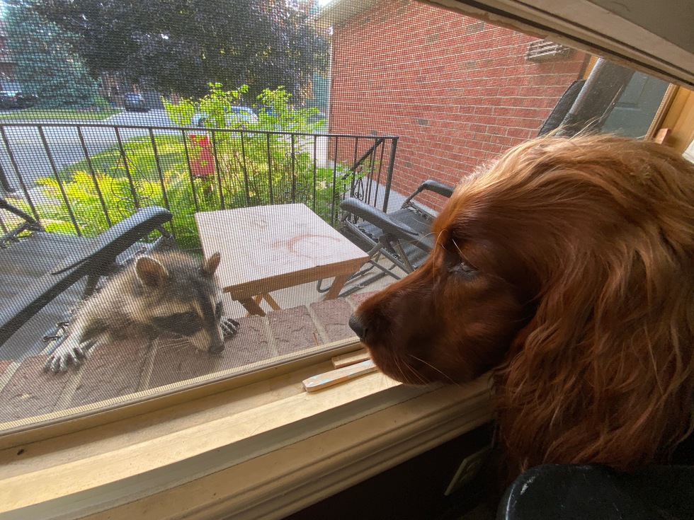Fern is one of our grand dogs who displays a natural curiosity and energy in viewing life around him. This moment was fun to watch as Fern and the raccoon were observing each other with silence. A definite memory for me.