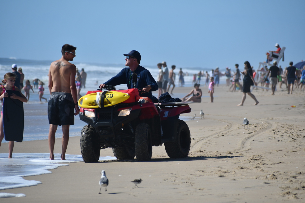 A candid moment with a beach guest and beach patrol