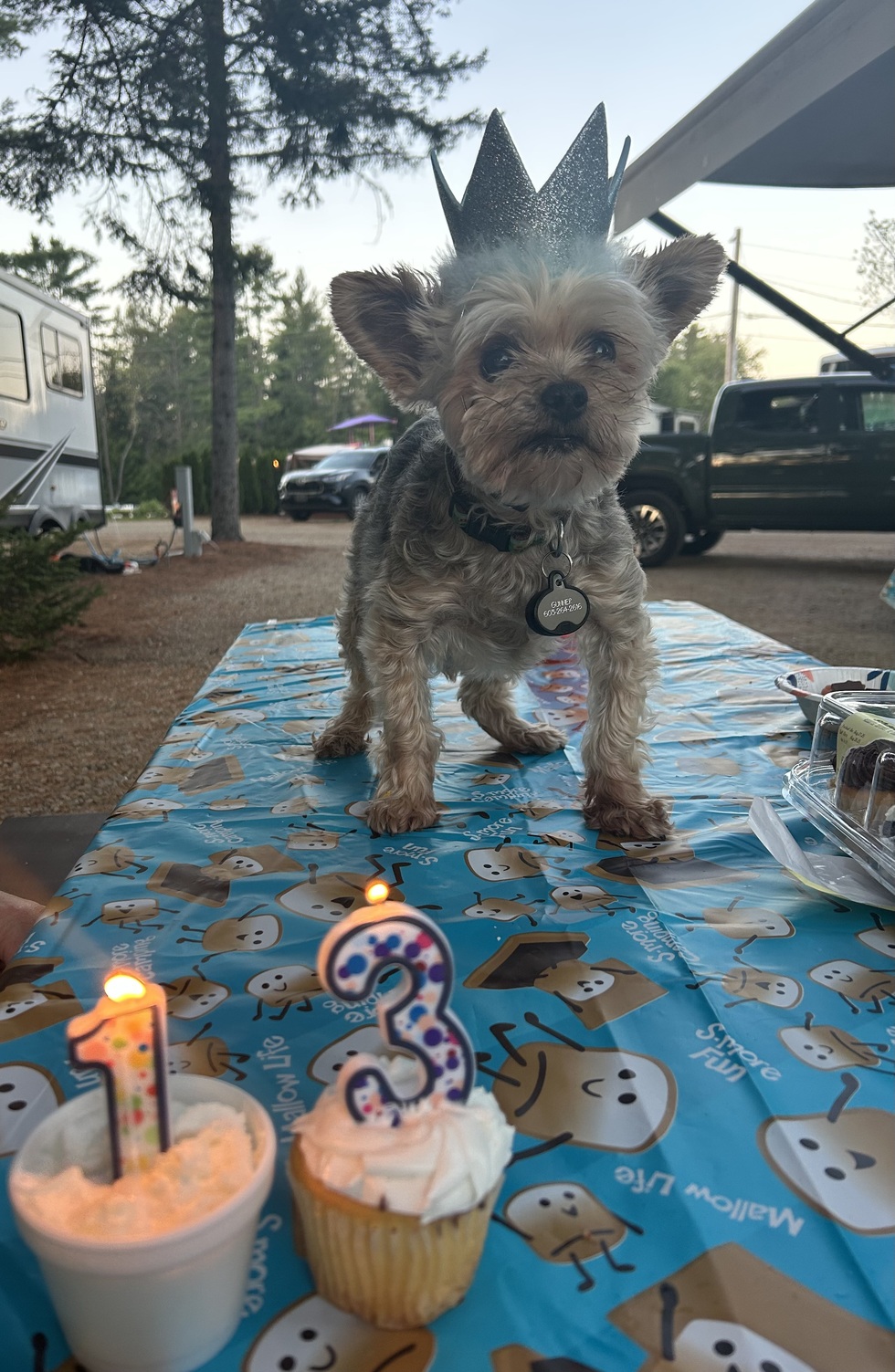Hi I’m Gunner! I just had my 13th birthday in August! I’m a Morkie. I love to play fetch with squeaky balls, enjoy going camping with my family and love treats! A fun fact, my mommy and I have the same birthday! My favorite team to watch on tv is the Patriots! I enjoy walks but not when it’s cold or when it rains. You can find me on my mommy or daddy’s lap most days or riding around in the car with them doing errands. If I’m good boy I get to a pup cup at Starbucks!