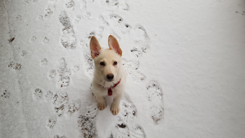Photo CaptionPuppy Ustinov's first snow.