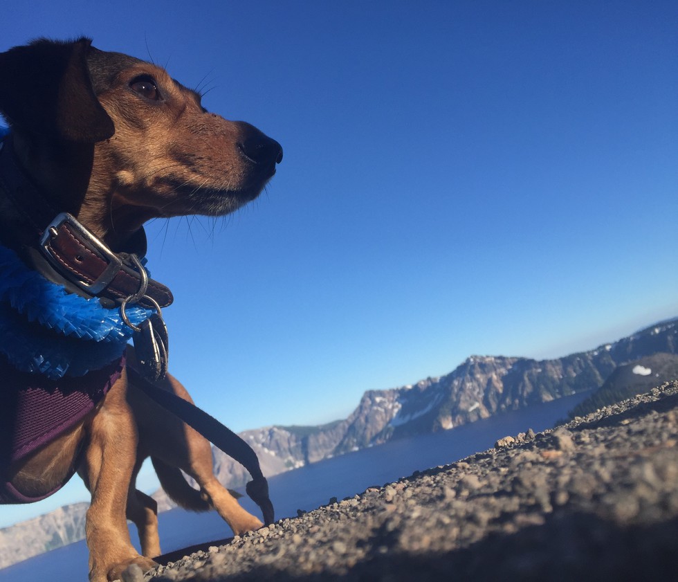 Visiting Crater Lake for the first time. Wizard Island is in the background. Very majestic scenery to Miss Haddie Mae.