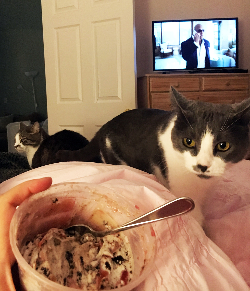 Photo CaptionI work for a local bakery that collaborates on ice cream flavors with Salt & Straw. While trying a test batch & watching Ballers, my cat Lucy, who LOVES ice cream, made it clear she wanted to test it too. Her poor brother, Luigi, has food sensitivities and never gets to try any. He is clearly not amused here.