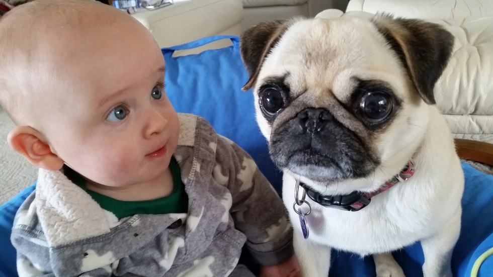 Zoe loves grandson, Avi. Zoe, the pug is always close to Avi, even at nap time.