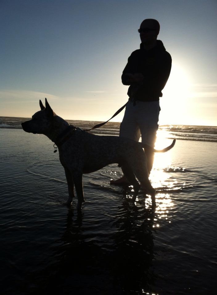 Rooster and his human brother, Caeleb...sunset on the Oregon Coast.