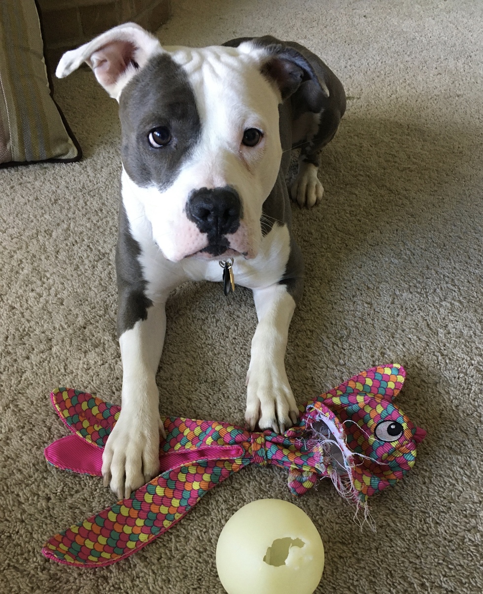Sugar is an OHS alum adopted 7 months ago! Her favorite activities include playing tug, destroying toys, and snuggling!