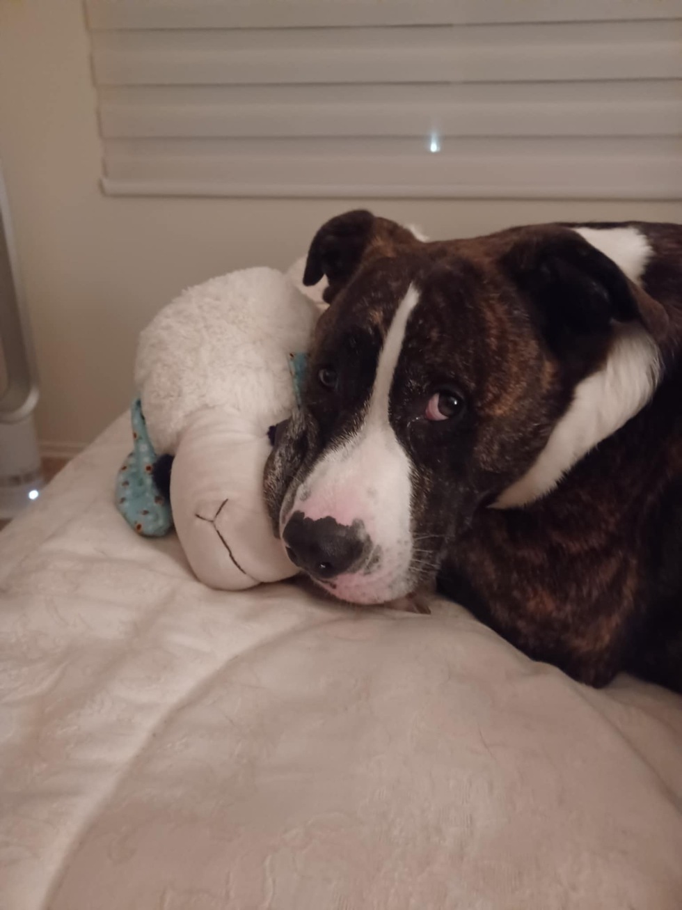AJ is a 4 year old Pitt mix! He is the ultimate love bug! He loves his friends, especially the ladies and his humans and friends humans. AJ’s favourite activities involve walks, playing fetch with a ball or big stick and playing in the river by his grandma’s house. AJ’s dislikes include being told he has to go inside and when the treat bag is empty!