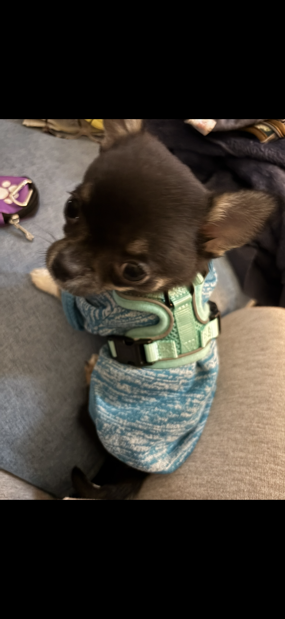 Adopted in a rescue situation gets along super well with my cat. This picture is his first day of puppy class. He does not look too happy about it either, in my opinion
