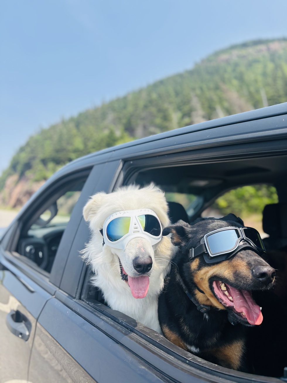 Paxton (11 - German Shepard mix) is a street dog born in the back ally in Alberta. He is the best companion any owner could ask for. He’s the one that makes you want a second dog… Then, Archibald (2- Great Pyrenees mix) is the dog you get. Turns out not all dogs are like Paxton! Archibald is a bundle of energy and a little more stubborn. He was the best decision as he added some pep in Paxton’s step as he’s getting older. This year we wanted to complete Paxton’s Canadian coast to coast travels so we went on a road trip out East as a family. Archie was a showstopper getting attention from every person walking by (even got a little girl yell “He’s SOOO fluffy!!!”), while Paxton took in all the sights and got to swim in the Atlantic ocean. They learned the hard way that salt water doesn’t taste good! Archie and Pax have become best buds who love going on adventures and playing together. This is a photo of the boys enjoying the majestic views along the Cape Breton Trail.