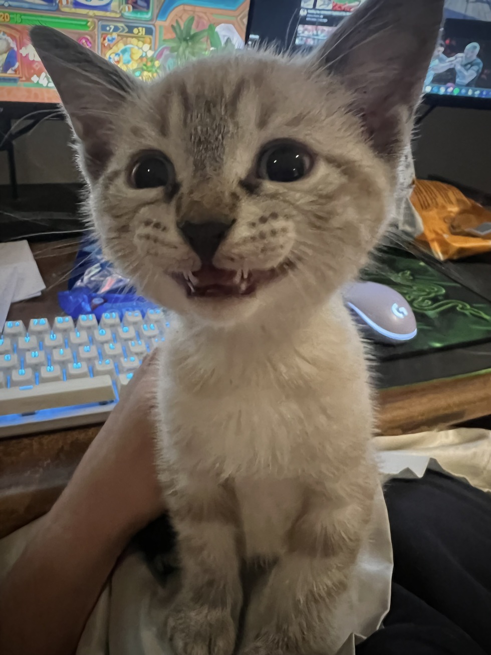 Eddie is a crazy little guy who loves socializing with his family. Whether he is cuddling in his mama’s neck, gaming with dad, wrestling with his feline brother Prince, or cuddling with his older canine sister Holly, he is always purring and adding so much love to our lives. Eddie enjoys heated blankets, sucking on fingers, attempting to eat human food, peeing in the toilet and tearing up toilet paper rolls. He is a bundle of adventure and love disguised as the cutest pet in Ottawa (in my opinion).