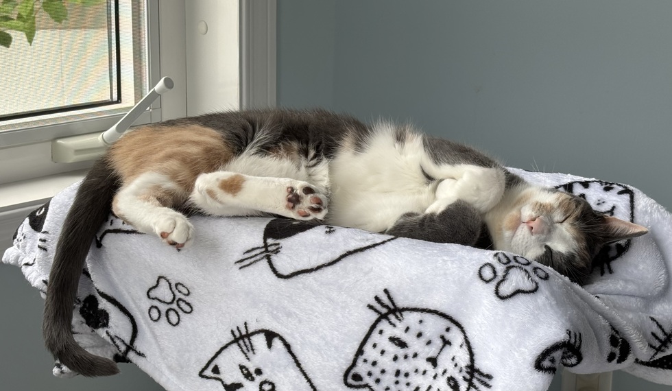 Melly is a very sweet, affectionate, and social kitty. She was adopted from the OHS as a kitten, and is very much a co-pilot. She is doing well so far, despite having cardiomyopathy. She enjoys relaxing on her various perches, watching for birds and squirrels, cuddling and spending time with her Mama and brother Timmy, playing, and having snacks.
