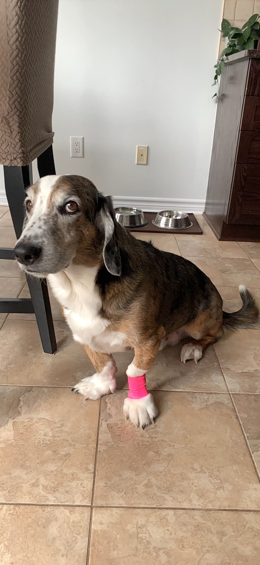 This is Charlie, he is a sweet gentle soul, he is a rescue and has been adopted by our family 6 years ago. Charlie loves to go to the park and chase his favorite tennis ball, he is wearing a bandage currently from a small injury at the park, and supporting pink for Breast Cancer research. In the evening he loves to play with his stuffed toys and scatters them all about the house before curling up in front of the fire for an evening nap. Charlie loves to go for walks rain or shine. In the summer he loves to chew on a frozen bone out on the sunny deck. Charlie loves treats! lots of treats!! Charlie loves to sing and howl as he is part basset hound and part Australian Sheppard, which causes confusion for him to ether be a hunter or a gatherer. He is a loveable friend and enjoys having his belly rubbed and cuddling with his favorite people. He is loved and he gives 100 times of the love back everyday! We love our Charlie!