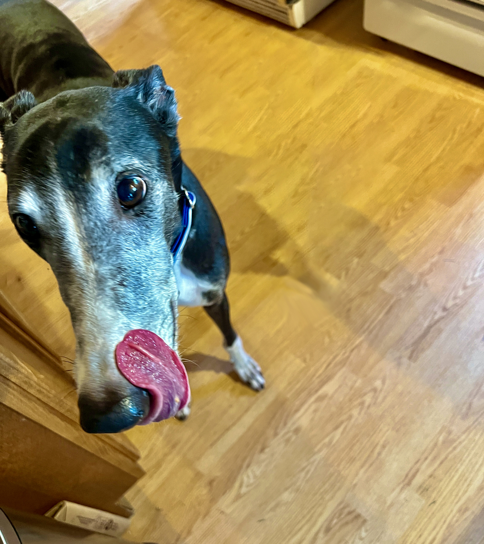 My name is Tux. I am a 9 year-old retired racing Greyhound from Florida. Emphasis on "retired", as now the only thing I race to is my food bowl. I love walks, treats, riding in the car, relaxing, meeting new dogs and people, and did I mention treats?!? I love those.