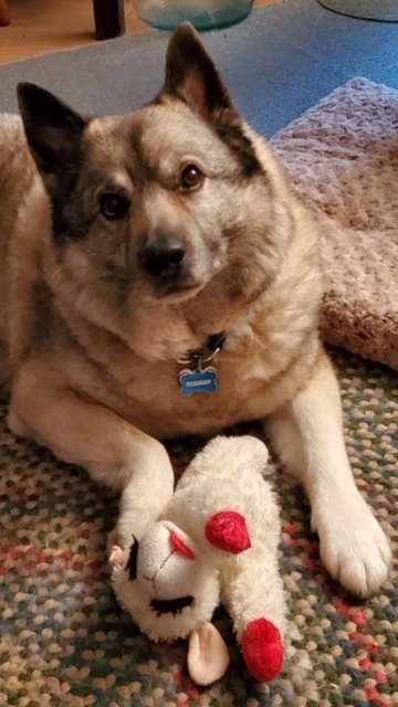 Shaman is a Norwegian Elkhound born in the north (of Connecticut) and as such loves the cold weather. He is very gentle despite his 55 lbs. According to him, he does not shed much and only emits "fibers of love". He is intelligent and understands a great deal of what we say to him. However he has also mastered the frequency control for his "selective hearing devices" (otherwise called ears). He is a peace loving dog and we often refer to him as "the dude" especially when other dogs are barking at him. Dude!...