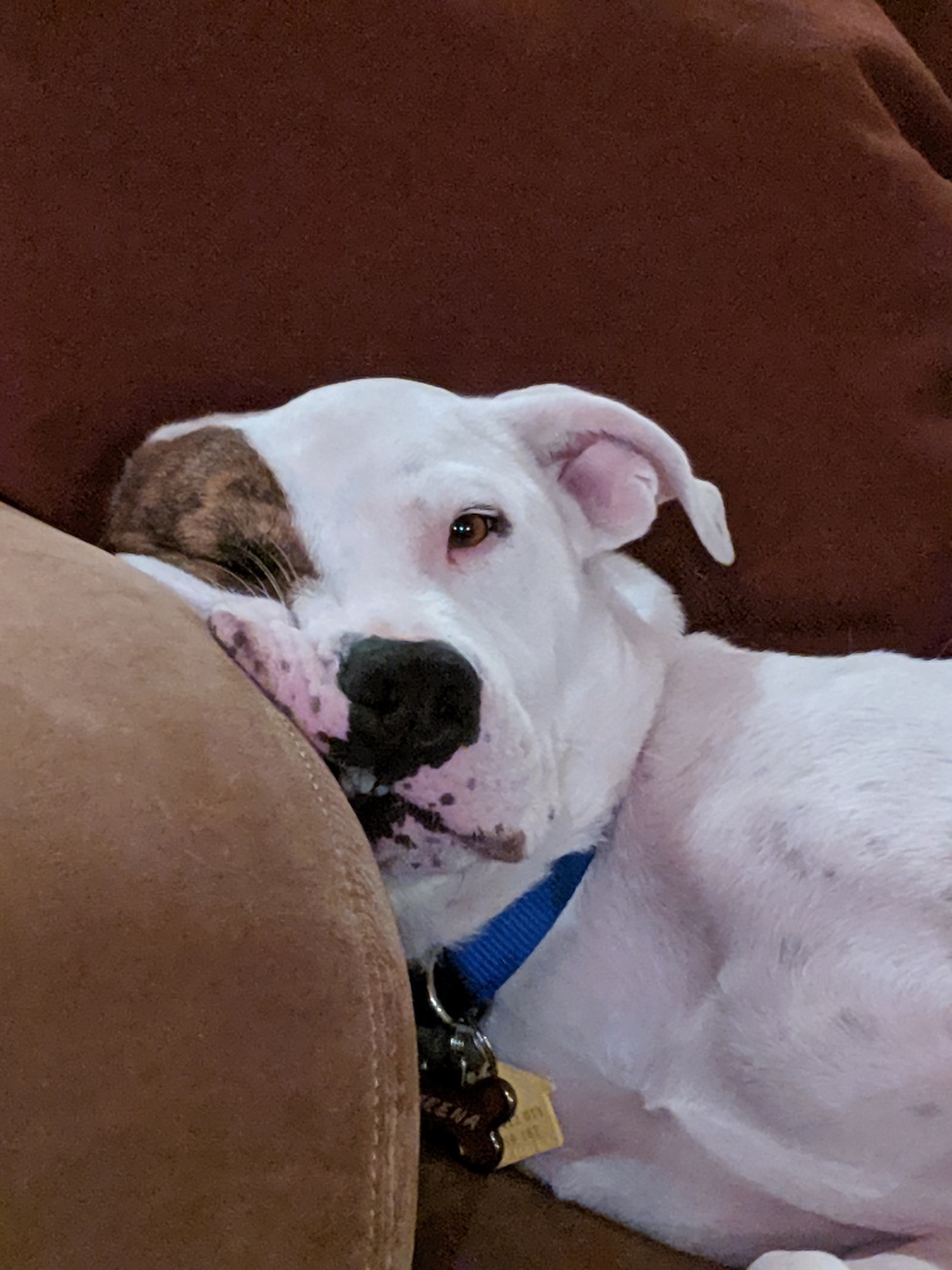 We adopted Meena in August 2019. She was always very she and a bit fearful, but has really come into her own (with a little help from her brother Lucky).