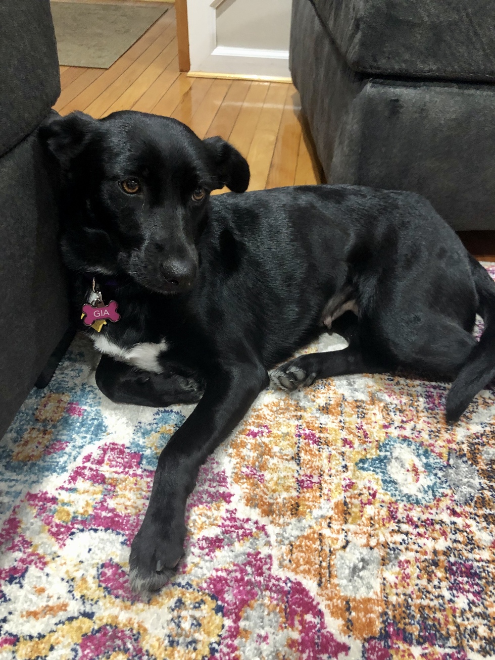 Gia (formerly Jade) is a beautiful lab mix originally from Georgia. She is a true Georgia peach! She is an absolute gem with such a gentle & sweet soul. She has the most beautiful golden eyes! She is such a fast learner. She learned sit, paw, and lie down in one day! She can also be a silly girl and makes us laugh every single day. Gia’s favorite thing to do is nap! But she also really loves her walks. She’s my favorite walking buddy! We love her so much and she has changed our lives for the better. We rescued her, but really she rescued us!
