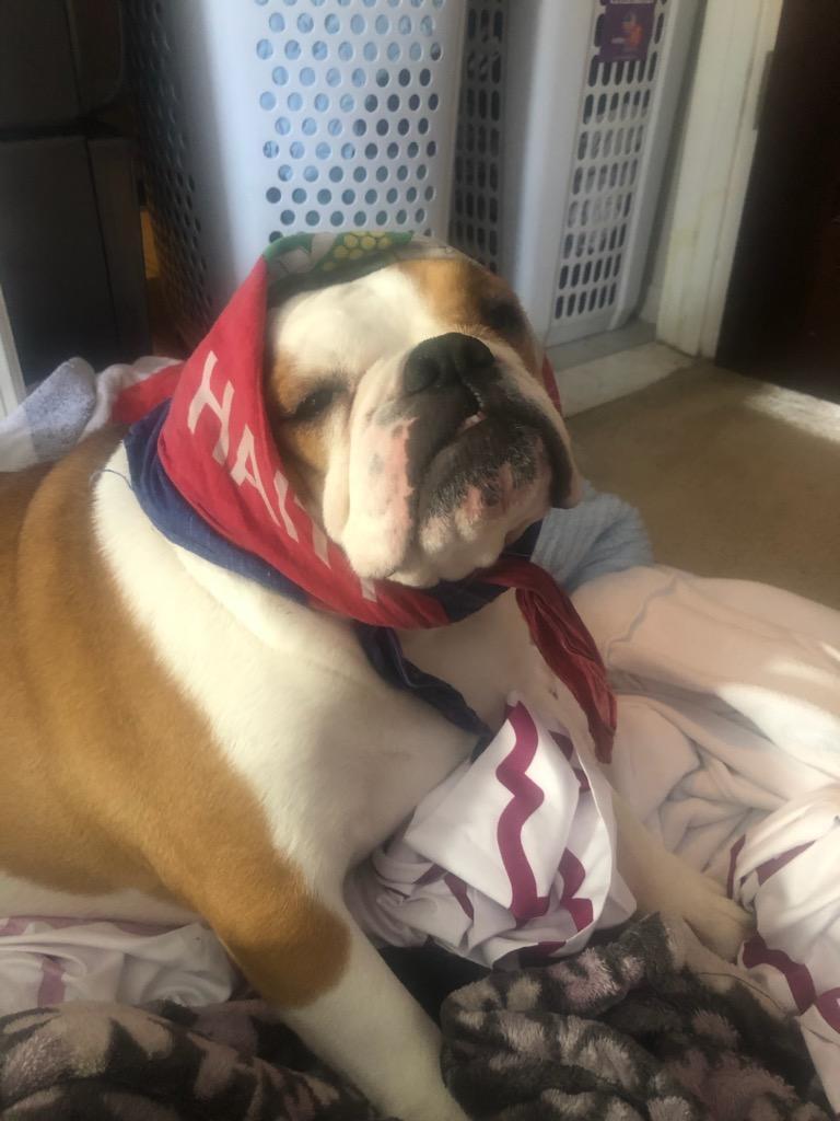 Elli is an English bulldog. She gives the best hugs and kisses. She loves to lay on the laundry. It's going to be Haitian flag day on the 18th of May so we decided to tie the flag on her head instead of around her neck for Instagram, enjoy the pic.
