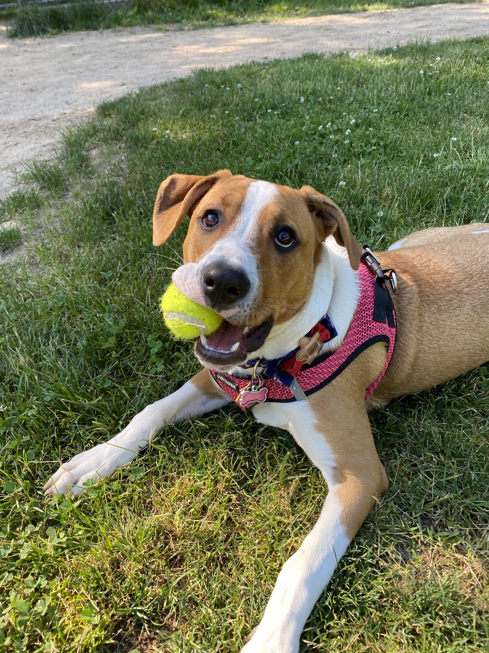 Lady is a mischievous pup who will kiss you to death! She was adopted in February, and has been extremely loved since the beginning. She is the new boss of the house, chasing around her five cat siblings. She loves to play with other pups, it’s what she looks forward to all day (besides her doggie ice cream treat). She also loves being on camera! It was so hard to choose which picture to post, but we think this one describes her personality the best!