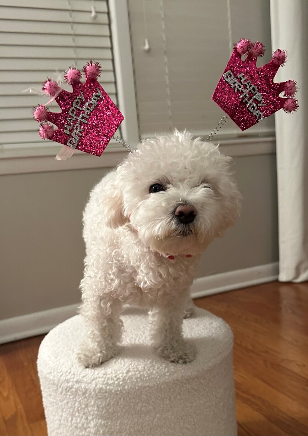 A little about me...This is a photo of Ollie on his birthday. He is six. Ollie enjoys napping on the top of the couch, a walk around the block each day, treats and snuggles.
