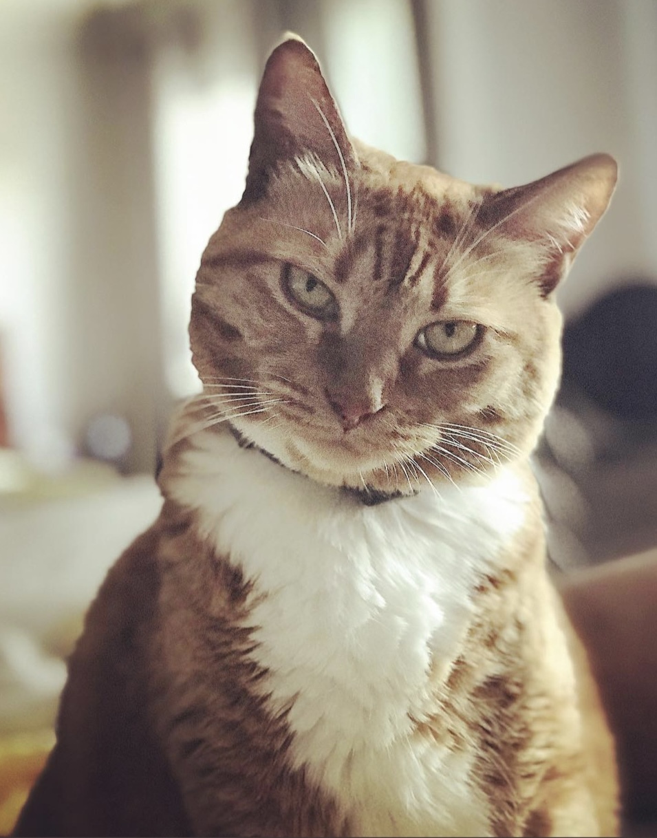 Haley is 14 years young. She was with a rescue in Los Angeles, where I volunteered. She was found with her mom, dad, twin and other siblings. I had arranged to deliver her to her adopter, but unfortunately kitty Parvo spread through the rescue, and she was exposed. I took her to a vet, and when her adopter was no longer interested, she joined our family! Sadly, her twin did not survive, but Haley lives on for both of them! She is a true orange tabby, with all the sass, healing powers, and love that comes with that!