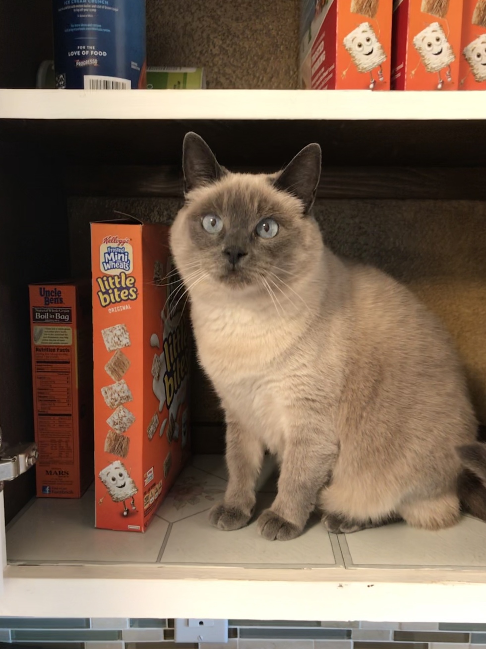 Pretty was diagnosed with chronic leukemia three years ago. She is currently on chemotherapy but that hasn’t stopped her from being the sweet foot warmer that she’s always been.  Rescued from the streets of Tijuana over eight years ago by the Southern California Siamese Rescue, she arrived with severe hotspots on her little body. After much trial and error, her itching was finally put in control.  She loves to walk on my head to wake me up in the morning and call to me with her little funny meow cry.  She is my little buddy. I am so grateful I got to be her mommy.