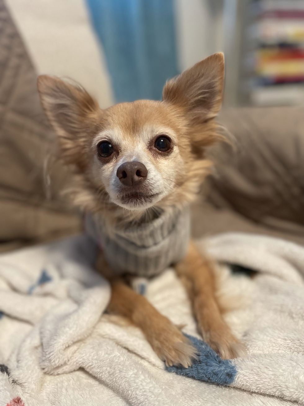 My story goes back about 11 years but those first 9 were a blur. I’ve already forgotten all about them. What I can say is that in November 2020, I was pulled from the NYCACC (city shelter) by the wonderful rescue org called Animal Haven. They took such good care of me until I met my person and my Chihuahua brother, Sprocket. They knew right away that I would fit in: I’m perfectly house-trained, I still get the zoomies and, at 7 pound on a good day, I’m easily transportable. Plus, I’ve only got six teeth (thanks to the dental provided by Worth St Veterinarians) so no worries about me eating anyone out of house and home. Now, I live in CT and wear sweaters in the winter and run naked in the summer. I miss my other human, Jonas, who is away at college, but I remember him by sniffing his shoes and snoozing on his backpack. Good luck to all the other companions out there! Happy you’re all so loved. -Penny
