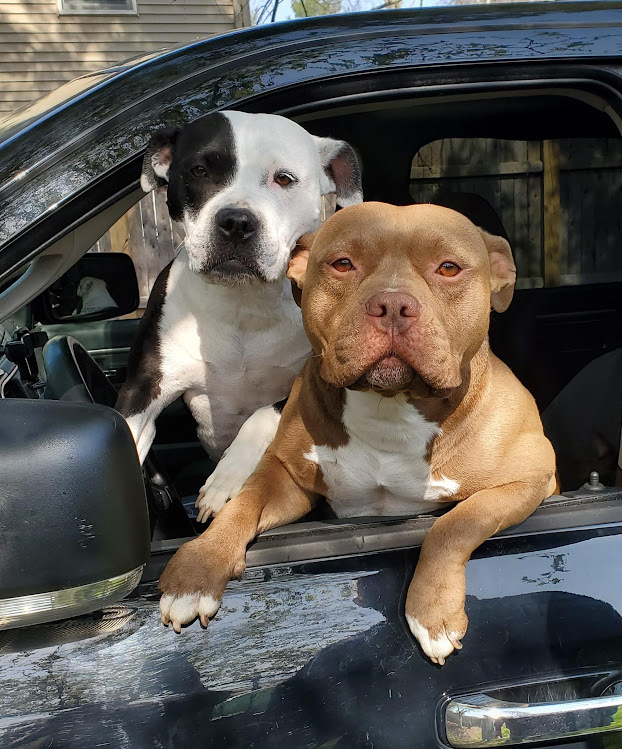 Both Katie and Copper are foster fails of 2021. We don't know too much about Katie's history but we sprung her from a boarding facility and she just jumped in the truck with us! She is so smart and a little intense, we call her Ka-tensity! And Copper came into our lives after BARC sprung him from basement living. We were quick to foster fail with him because he is the sweetest soul ever! We are truly blessed to add them both to our family of 4 dogs.