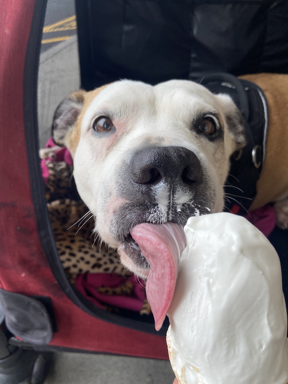 Honey was found as a stray on the streets of New York City many years ago where she landed at the New York ACC and was placed on the euthanasia list. She was clearly a mom used for breeding and then dumped. She was pulled by a rescue and landed with her current family as a foster fail. Honey is the sweetest dog who has welcomed many fosters into her home with a wagging tail! She loves everyone; people and dogs, big and small! She has even helped save other dogs from municipal pounds in CT by being a dog tester. Honey lost one of her front legs to bone cancer in November, 2021. Sadly, the cancer has metastasized to her remaining front leg. She does not have much time left on this earth, 😞 but she is spending the rest of her days being spoiled and loved by her family by taking daily walks in her stroller, dips in her doggy pool, rides in the car for ice cream and french fries, and going wherever her family goes!