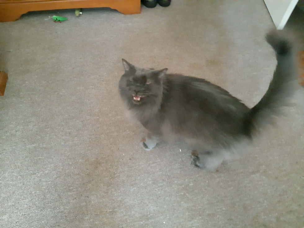 Buddy is a rescue, I took him in after his original owner passed away. He started out hiding and shy and very very nervous..today he is still nervous but wayyy more social.. he talks ALL the time. He loves his treats and playing and of course getting love and affection.His favorite time is in the morning.. as soon as he hears me get up.. Its time for a big hug.. if i don't , i will never hear the end of it.. Like this picture.. He was telling me he wants to play.