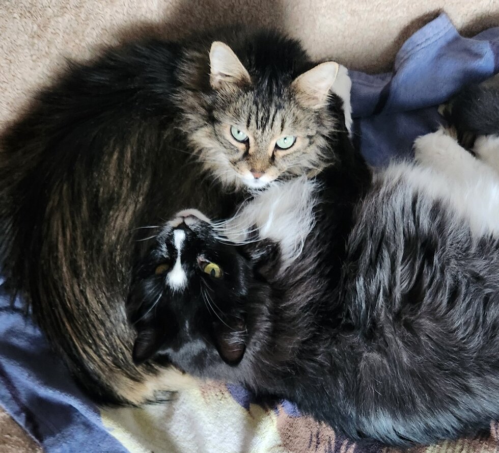 Doug the 12 year old tabby and Moe the 14 year old tuxedo aren't siblings but they sure are a tightly bonded pair of lover boys. We've been living together over 3 years since we met thanks to PetitsPawz. Moe is a mellow sweetheart, he's diabetic and is really a gentleman about getting glucose testing and insulin every 12 hours, he waits for me, meows to remind me of the time and purrs even when he's getting an injection. He's shy Doug The Washing Machine's support animal, Doug appreciates Moe's massages and gives head washes immediately on demand as soon as Moe puts his head under Doug's chin.