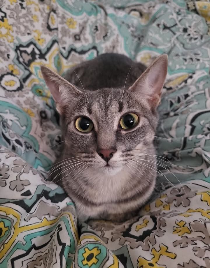 The runt of a litter of a poor mom we rescued from a crack house with 19 other cats! We made sure she lived by pushing her between the larger kittens so she would get fed. Here she lives, loved and healthy! She's a beautiful companion to my neurodiverse son who is the one who stayed up all night with her.