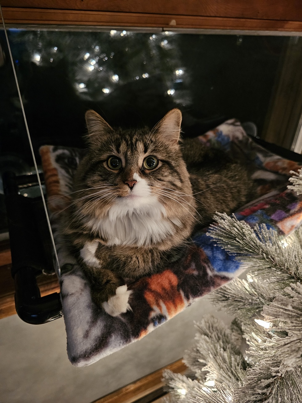 My boyfriend and I stopped into our local humane society one evening to look at kitties. We went through all of the pens, meeting and greeting each one. I turned around and saw Cashmere perched on a cat tower, who just came in as a surrender and wasn't up for adoption yet but I knew I had to have her. It was love at first sight. She has been with us for a couple of years now and is truly one of a kind. She is the sweetest, most mischievous, full of character cat I have ever met. She loves to explore our home and is our official "box inspector". From sleeping between our legs at night, in our laundry hamper, or in a cooking pot on top of our fridge, she suprises us in some new way every day. She is so smart and knows exactly where her treats are kept, and how to get into them. Cashmere is so curious and loves to explore. She desperately longs to be an outdoor kitty, but is content with watching the birds from her window hammock. She gets along great with our other 3 cats and 2 dogs. Our hearts are so full.