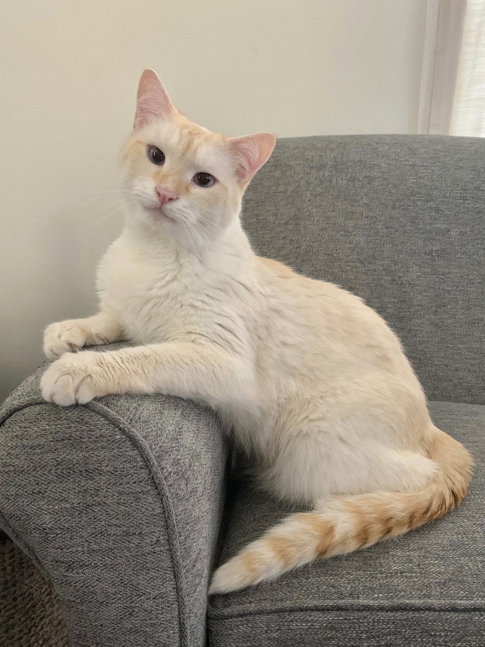 After the loss of our cat, we knew it'd take time before we added another to our family. We learned so much about flame point Siamese during our time with him and knew how special this breed was, but we were in no hurry and knew the right fit would come along when it was time! Seven years later, we heard about Pet Pride for the first time and saw Mr. Business's handsome little face snuggled up with his sweet brother! Pet Pride was so kind and patient. We were so excited and ready to add our new family member! He needed no warm-up period, he was one of us immediately.. and that meant any soft spot in the house could be one of his beds anytime he chose from now on! He will curl up directly on my face while I sleep or even think he's a scarf, meow very loudly to say hi or greet us at the door when we come home, slide upside down and backwards down the stairs like something from a horror movie and sit on the couch like an actual human being.. using the arm rest and all. He's a total weirdo and we love it!