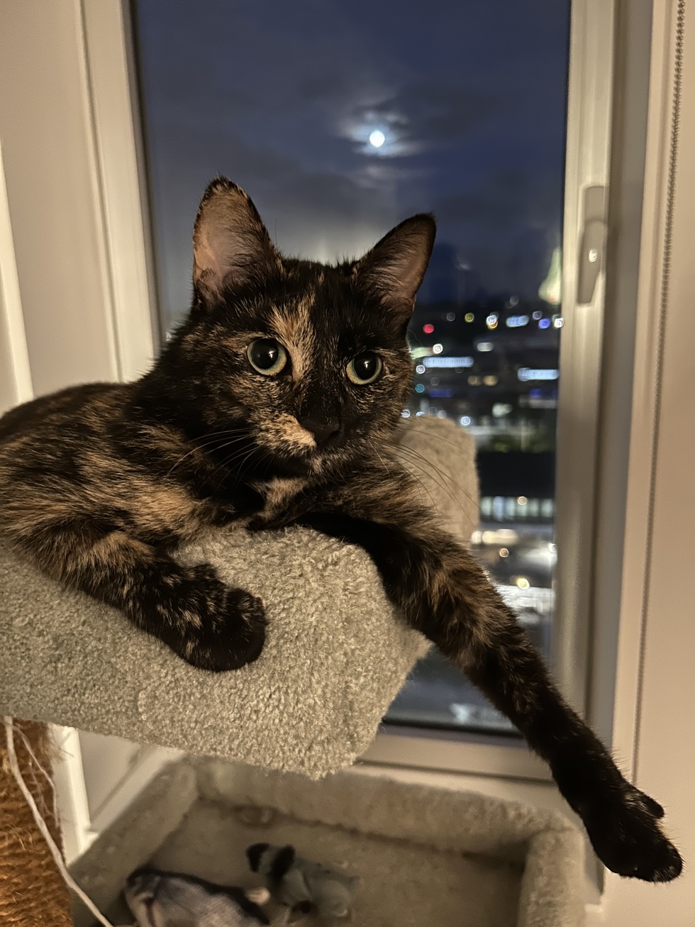 When we first visited Gussie (aka Brooklyn, at the time) at Pet Pride, she enjoyed her safe roost atop the cat tower. We were looking for a tortoiseshell to adopt and Gussie caught our eye. We were told that her first couple of years had been rather rough. She arrived at Pet Pride with extensive mouth sores and developed a respiratory infection that threatened her life. The staff restored her health and prepared her for a new home and a better life. Gussie won our hearts and we decided to welcome her into our lives. Her journey from Pet Pride to our home was a stressful one and she initially hid under the bed for a few days. She soon acclimated to her new environment and became an incredibly playful and affectionate companion. She still loves her roost atop the cat tower where she can oversee the city of Rochester. We are so fortunate to have Gussie in our lives. – James and Mike