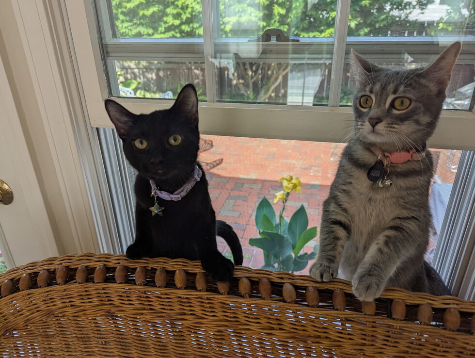We adopted these two young female kittens from two rescue organizations, Cerce from Pet Pride and Patricia Sunshine from a another local rescue. They bonded with us and each other immediately! Cerce, an all black, sleek Bombay, is a character who loves to snuggle, play and especially to jump. She is affectionate and dominant and loves to be held and and cuddled. Patricia Sunshine is a silver tabby and is more reserved, but she's sweet and loves to be pet and scratched around her head and ears, especially when she wakes up in the morning. They locate each other in the house with chirps and short meows, and often sleep holding each other. They understand all kinds of words including "let's go eat!" And "ready, aim, fire" as we toss their toy springs. They follow us everywhere! We've trained them with little click sounds. The photograph we're submitting was obtained when they were hiding behind a wicker loveseat; we clicked , and they both popped up at the same time, and we snapped the photograph. We love these two characters so much! Thank you Pet Pride for such a lovely experience!
