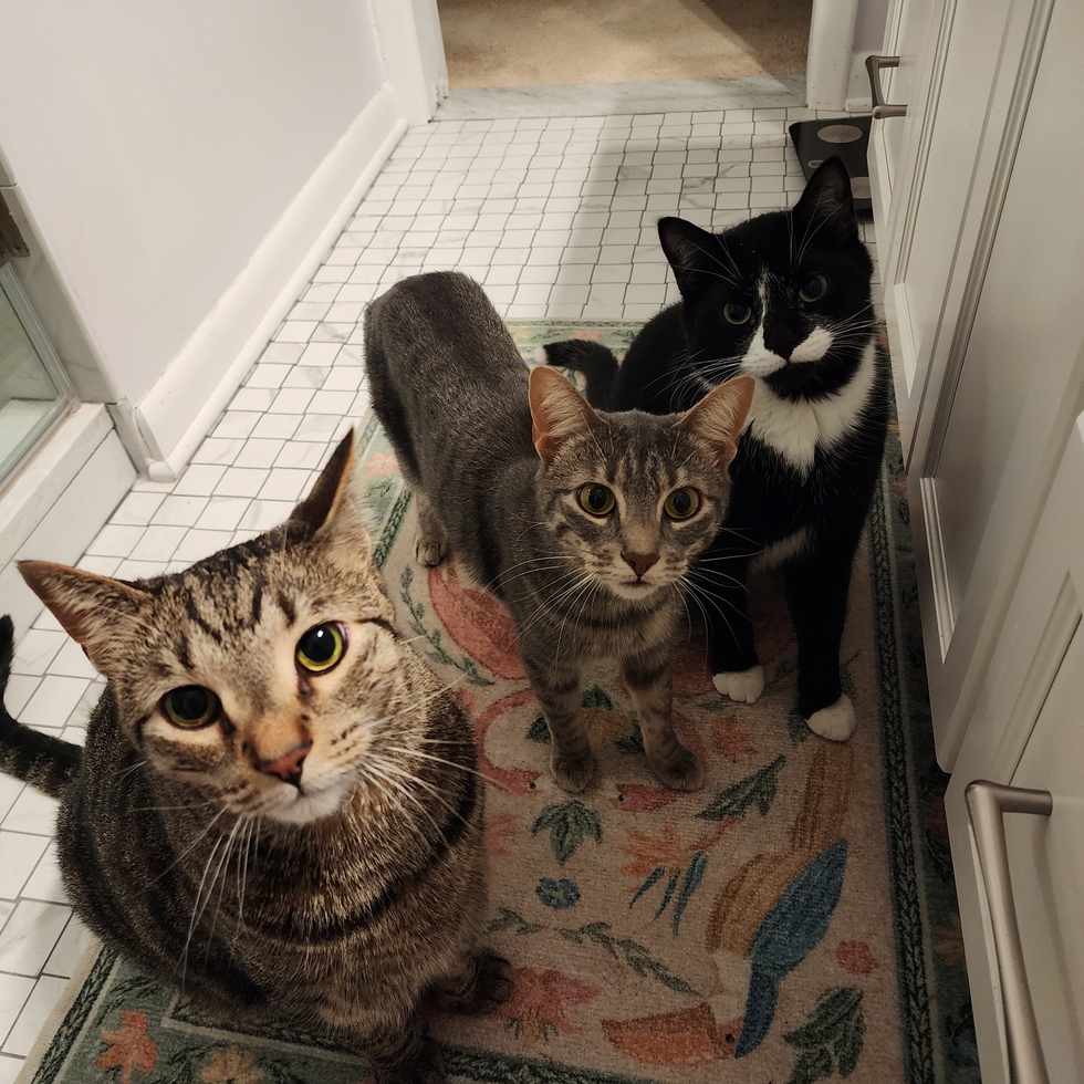 Marge and Shifty (Grace and Chocolate Chip) were adopted from Pet Pride in January 2025. They are a bonded pair that were never socialized as kittens. They are slowly getting used to the humans with help of their brother Barcley.