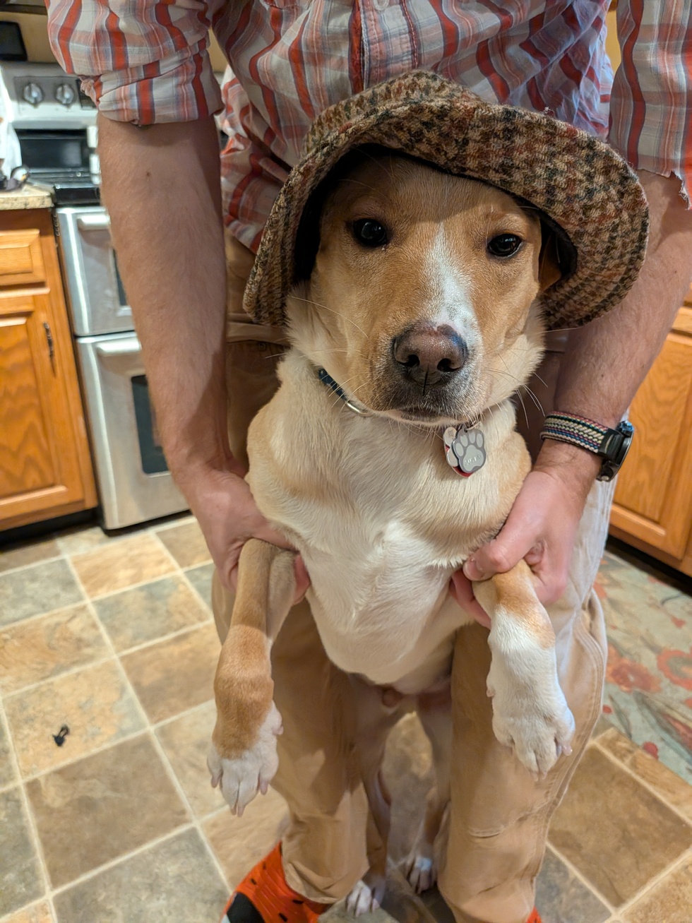 Gustav is a rescue from Pope Memorial SPCA. He came up in a transport from Texas in the summer of 2025. He is absolutely wild and still learning the ropes. He is obsessed with his dog brother Malcolm, lives for stealing the rugs from around the house and is a first class cuddler.