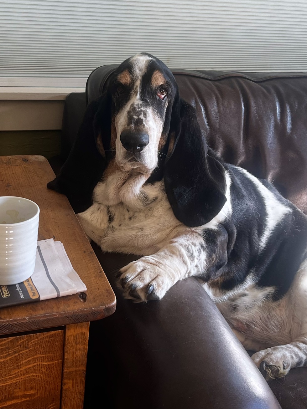 Ezzy is 11 and has cancer. But in true hound fashion, he doesn't let it stop him. He has been a proud Concord resident for 9 years now. He is a chunky smooshball who probably would enjoy a good beer as much as he seems to like coffee. He has never met a person, or kitty, he didn't like, and only a couple dogs. His favorite holiday is Concord Market Days, when he accepts the adulation he feels is his due. He loves belly rubs, rides in the car, long walks on the beach, and watching birds. His legs are just long enough to keep his ears from hitting the ground. And his real name is Ezra ZenMaster,