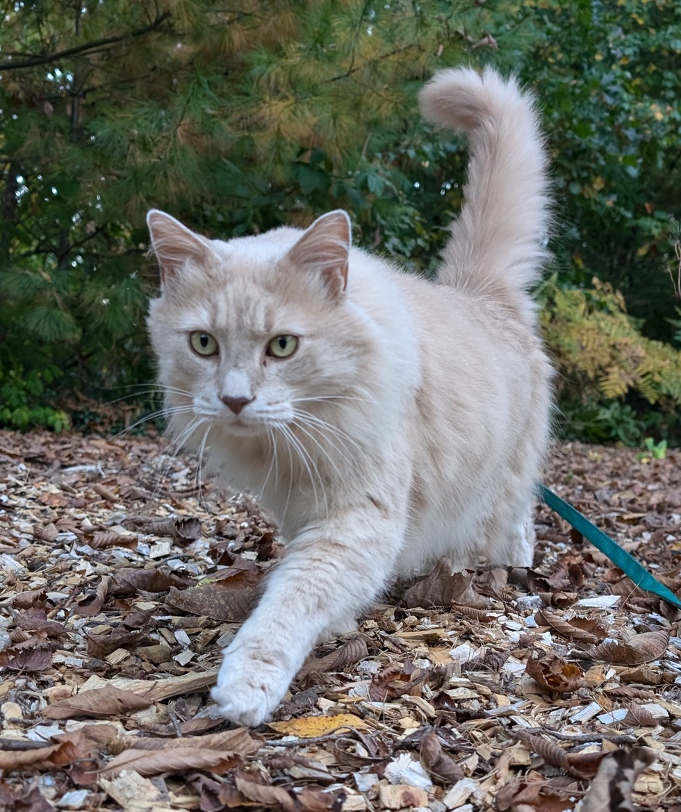 Mr. Rams is a Longhaired House Lion and feels his breed is misrepresented as just another brainless orange cat. At least he's smart enough to tell his mother when he wants walkies on his harness.