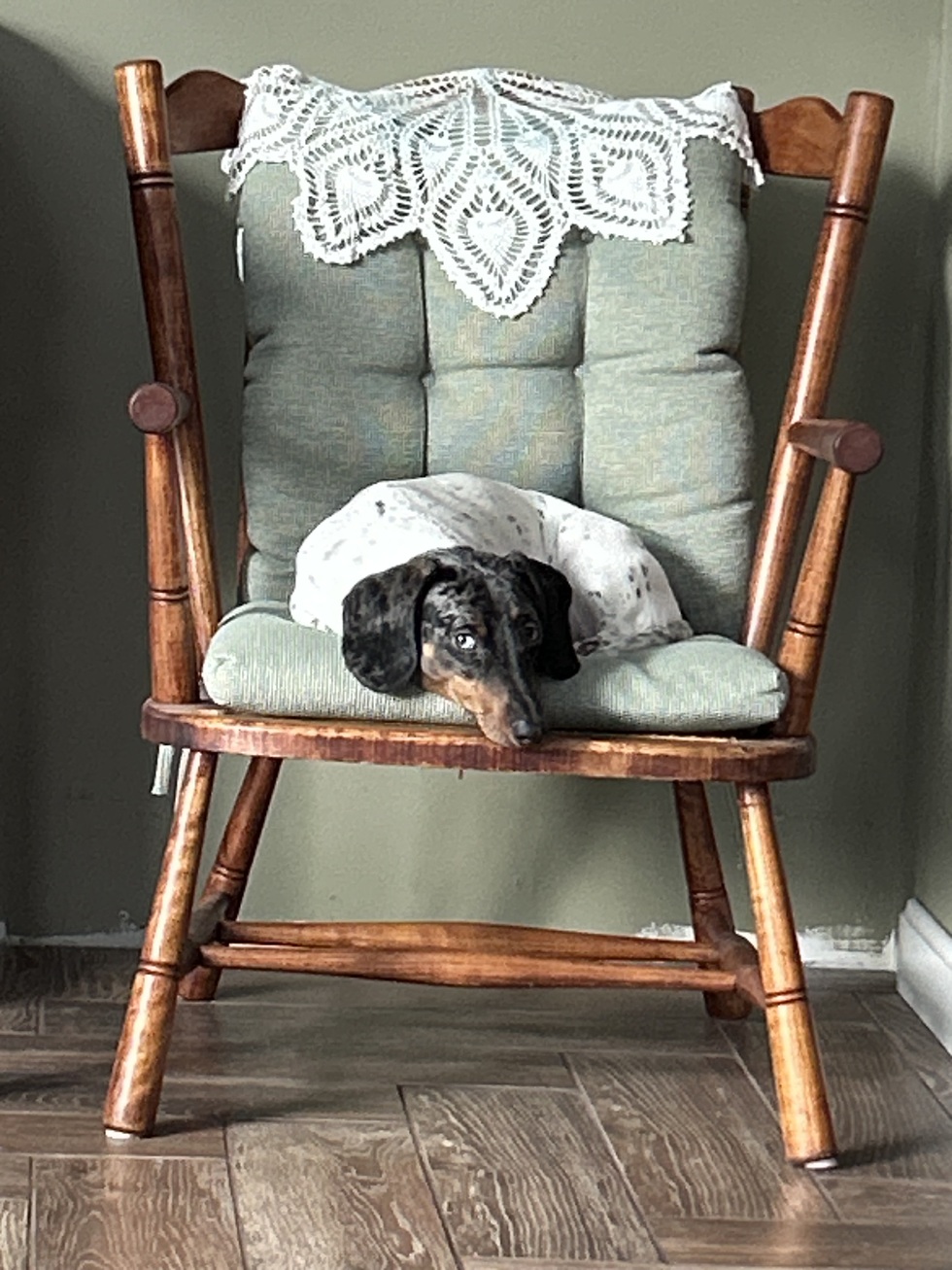 Rescued from TN. Came to us very sick and with a tapeworm. We quickly got him some veterinary care and on the road to recovery. He’s the smartest dog I’ve ever owned. He’s a piebald dappled dachshund.