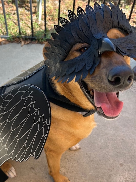 Belle is the best dog, with a bit of a dark Raven spirit. She loves treats, playing in the park, taking walks, meeting with friends, but when night falls, she dons her Raven wings and beak and guards the house from intruders and mayhem. She will soon celebrate her 5th birthday. She was adopted from the Helen Woodward Animal Shelter in 2021 and we have been happy, and safe, ever since!