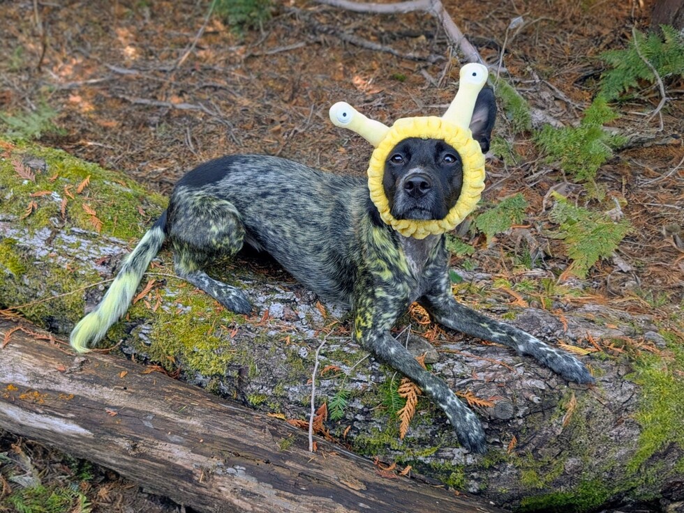 This is 2-year-old Millie, dressed as a banana slug! I got Millie at 3 months old, and she quickly became the unofficial mascot with my work crew, charming everyone she meets with her wiggly butt and soulful eyes. She is a constant source of comfort and laughter through life's hardest moments and has an endless supply of love that she gives freely to everyone she meets. I lost my parents last December and Millie has been the gentle nudge that gets me through each day. She's my hero and, she's here to remind everyone that sometimes the best therapy has four paws and a mischievous grin!