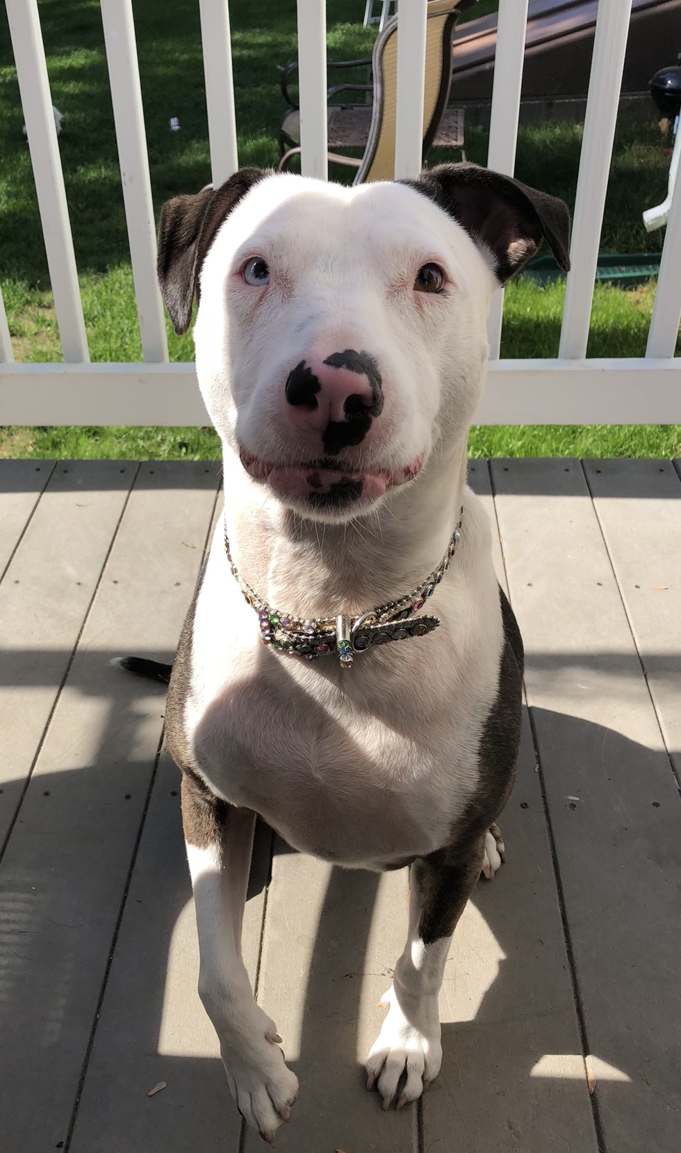Miley was rescued from a kill shelter in GA. The minute she walked off the transport bus she ran up to me and looked at me as if she knew I saved her. She is a total goofball. She can not get close enough to you and sits on your feet. She also sits on the couch like a human. She is by far the best loving dog ever!